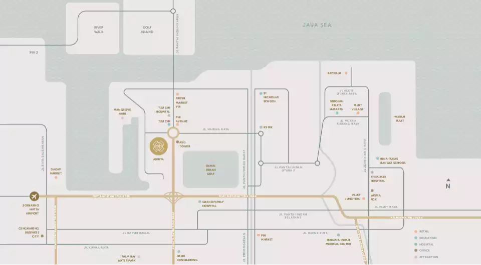 Apartemen Adriya berada di kawasan Pantai Indah Kapuk, tepatnya seberang Mall PIK Avenue, bersebelahan dengan Tzu Chi School.