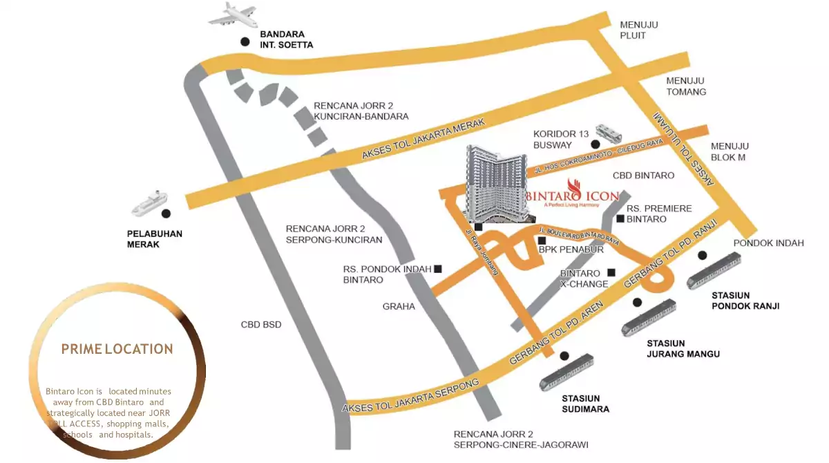 Apartemen Bintaro Icon berlokasi strategis di dekat CBD Bintaro, dengan akses langsung menuju Tol Parigi – JORR 2 yang akan segera dibuka. Dikelilingi Komersial Area dan 3 Stasiun KRL.
