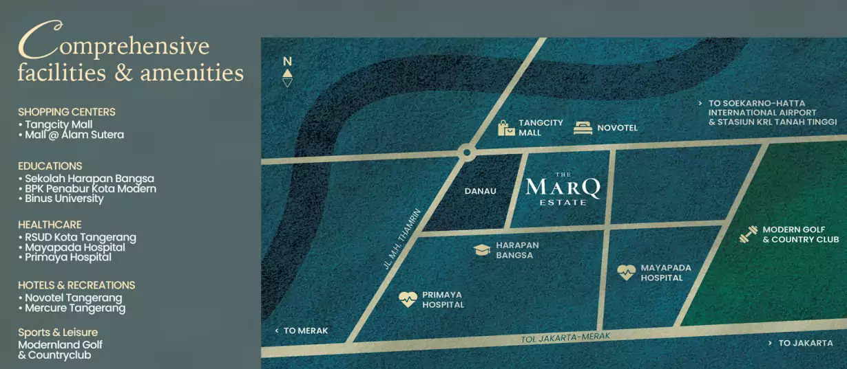 Marq Estate berlokasi di Kawasan Metropolis Tangerang, berseberangan dengan Tang City Mall, diapit 2 Supermarket besar, hanya 10 menit ke Kampus Binus.