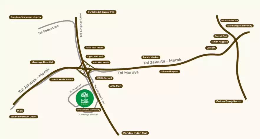 Pacific Garden Puri berlokasi strategis, hanya 10 Menit ke Tol Gate Meruya Selatan, Sekolah IPEKA serta 13 Menit ke Lippo Mall Puri.