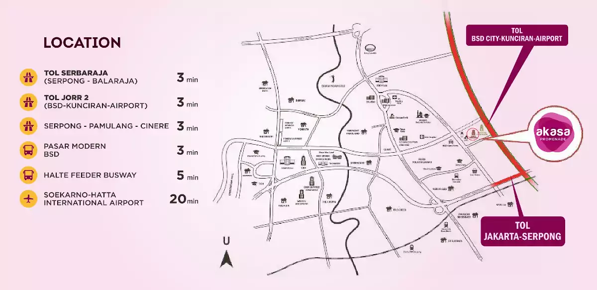 Ruko Akasa berlokasi di Kawasan Apartemen Akasa BSD, hanya 3 menit dari Akses Tol (Tol Kebon Jeruk, Tol Kunciran, Tol Pondok Indah), 5 menit dari Stasiun Rawa Buntu & Sudimara.