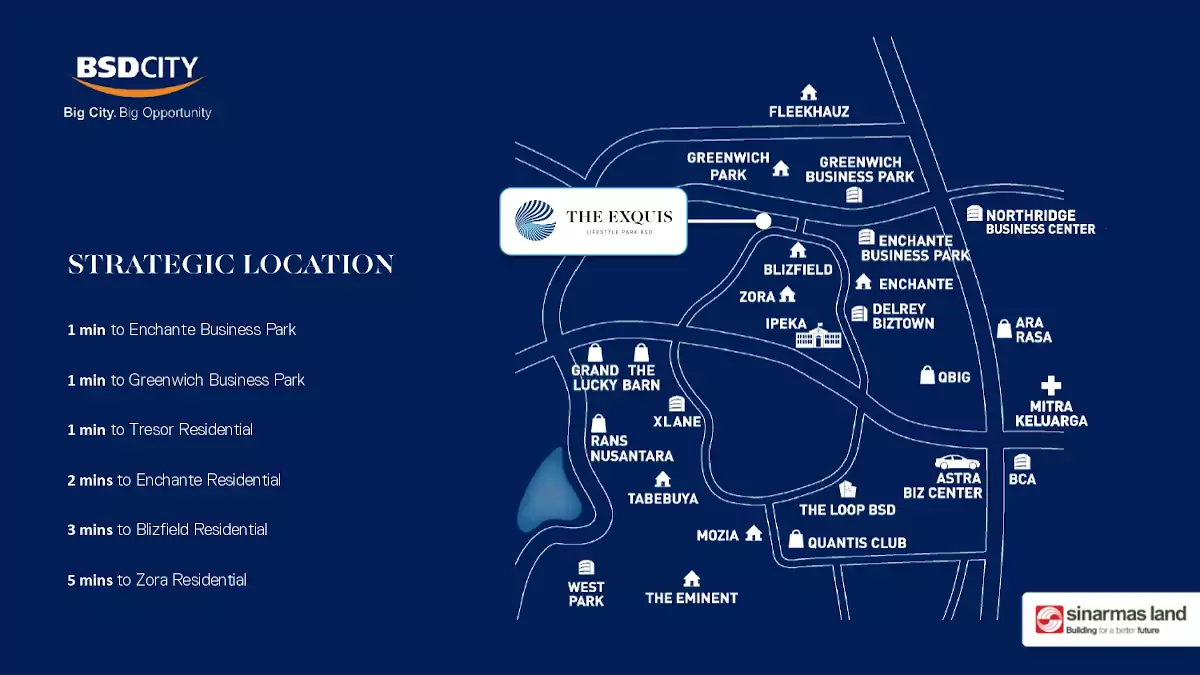 Ruko Exquis berada persis di depan perumahan mewah Enchante BSD, semua unit hadap jalan utama, dan diramaikan banyak tenant ternama.